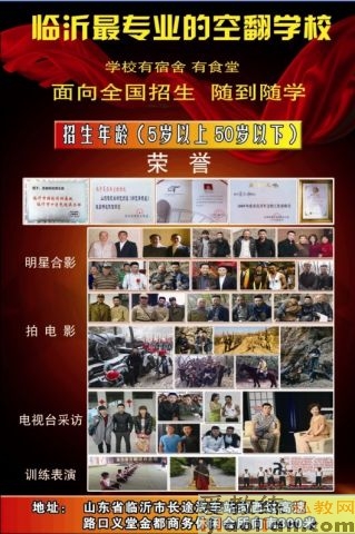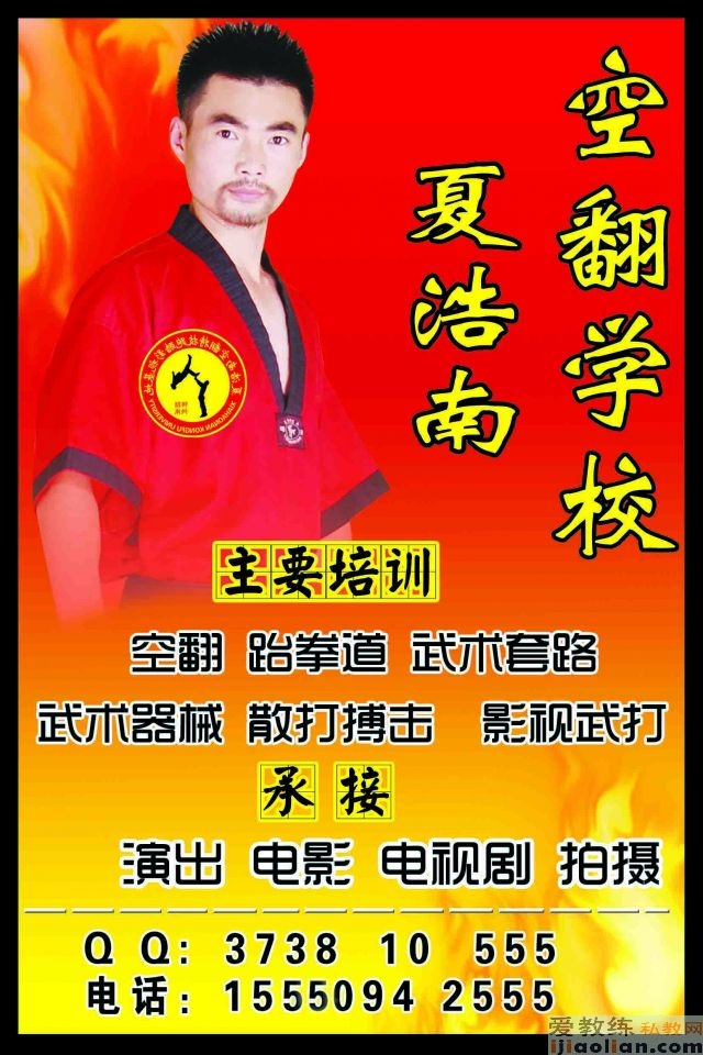夏浩南空翻学校 面向全国招生 随到随学 主要培训:各种空翻 手翻 跆拳道腿法特技 跑酷 极限武术 散打搏击防身术 影视武打 综合训练馆 年龄5岁以上 50岁以下 均可报名 常年为影视公司 影视城 夜场演艺吧 提供特技演员 QQ:373810555 电话:15550942555 欢迎您的加入